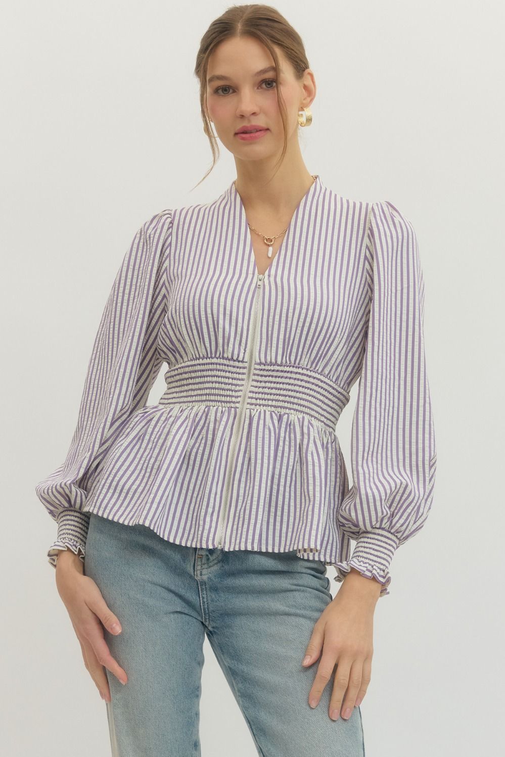 Stripes meet style in this charming long sleeve peplum top! The smocked waistband cinches your silhouette while the V-neck flatters from every angle. Zip up front for easy on-and-off, and check out those adorable smocked cuffs with ruffled trim. Lightweight woven fabric keeps things breezy and comfortable all day long. Perfect for mixing fun prints with your favorite basics!