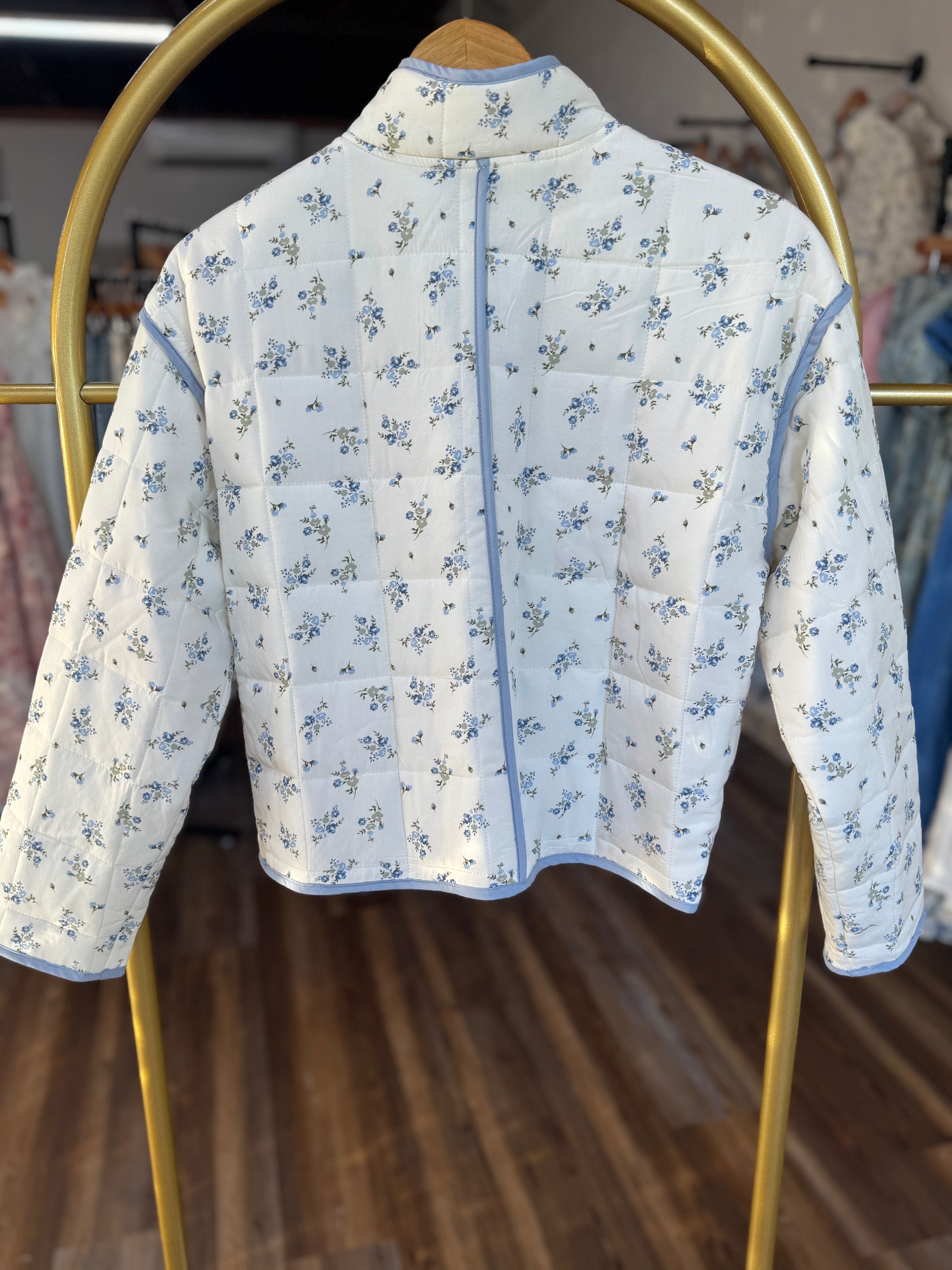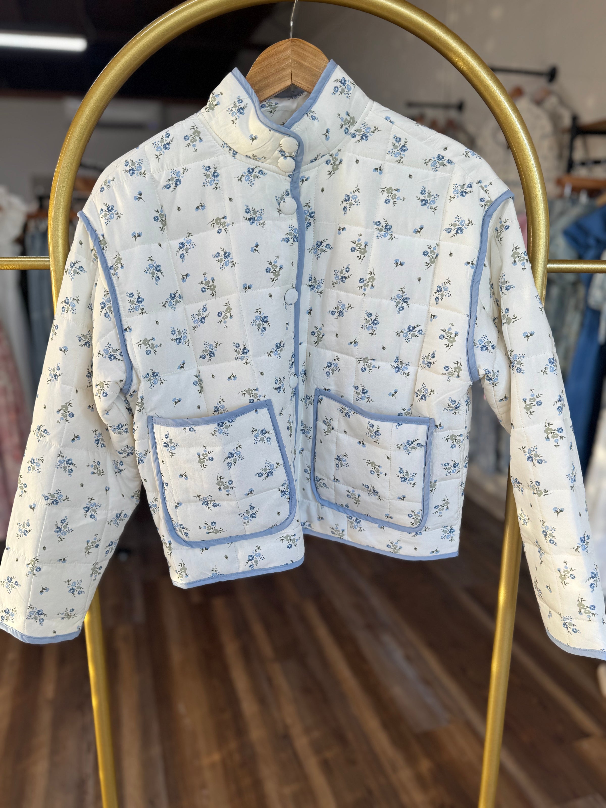 Stay cozy in style with this quilted puffer jacket featuring a charming floral pattern. The mock neckline and snap button pockets add practical flair, while delicate button cover details and trim accents elevate the everyday look. Perfect for layering through chilly seasons!