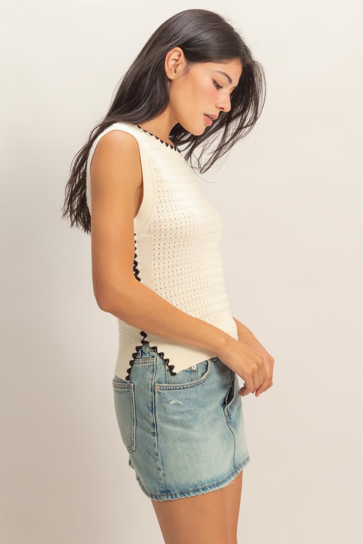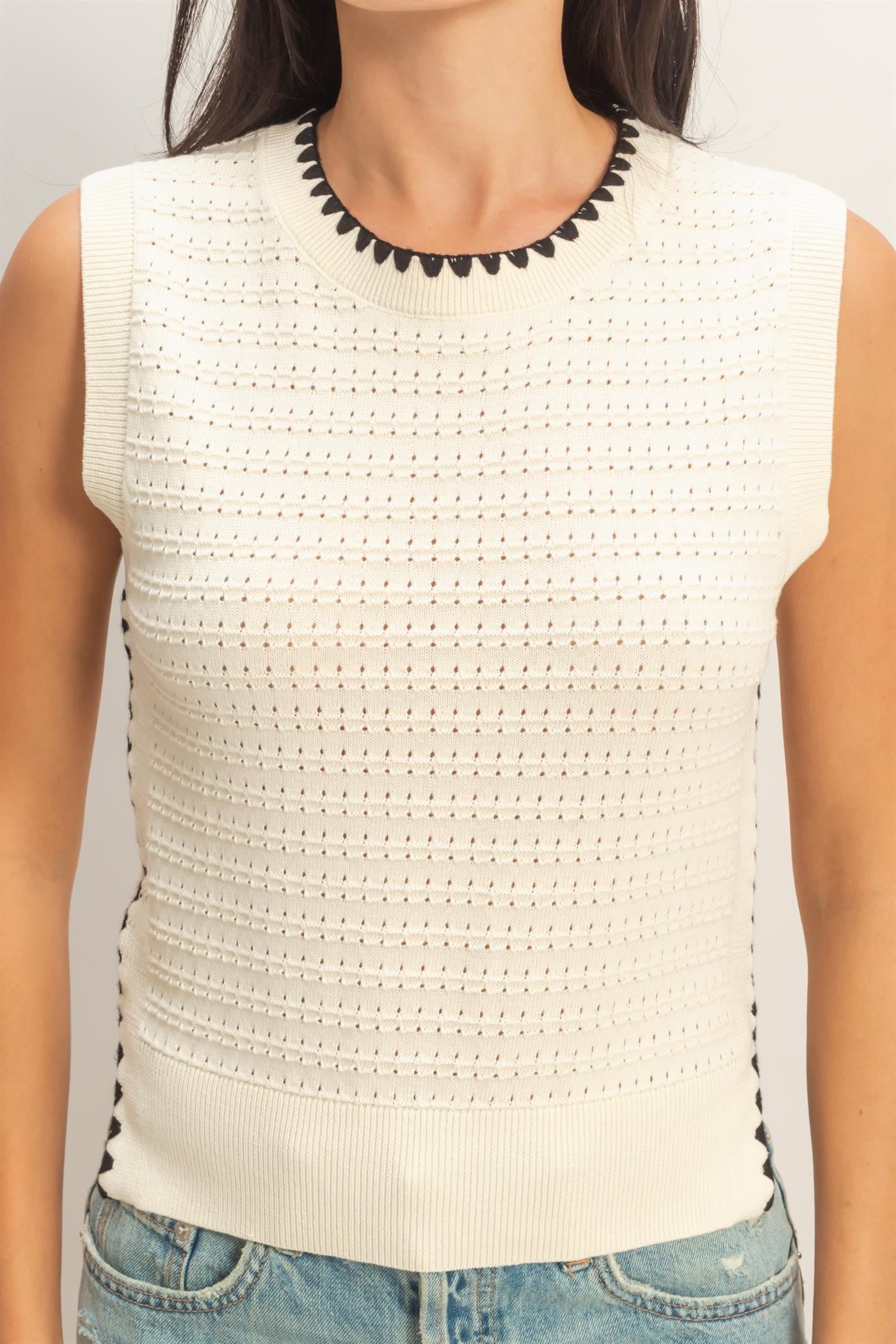 This textured knit vest features a crew neckline accented by contrast blanket stitch details along the seams. Cut in a relaxed, standard fit, this sleeveless top drapes to the hip. Pair with high-waisted jeans and ankle boots for a polished daytime ensemble. 55% acrylic 45% cotton Model Is 5' 8" Tall, 32" Chest, 25" Waist, 35" Hips And Wearing A Size Small Imported. Designed In The USA