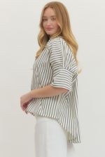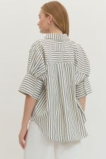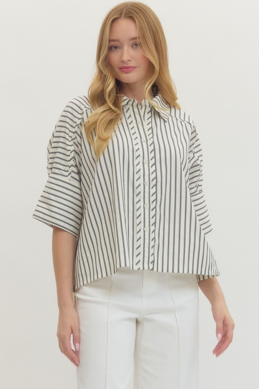 Stripes meet sophistication in this lightweight woven button-down. The 3/4 sleeves feature charming button details at the cuffs, while the unlined, non-sheer fabric keeps things breezy and comfortable. Perfect for layering or wearing solo—effortless style that actually works.