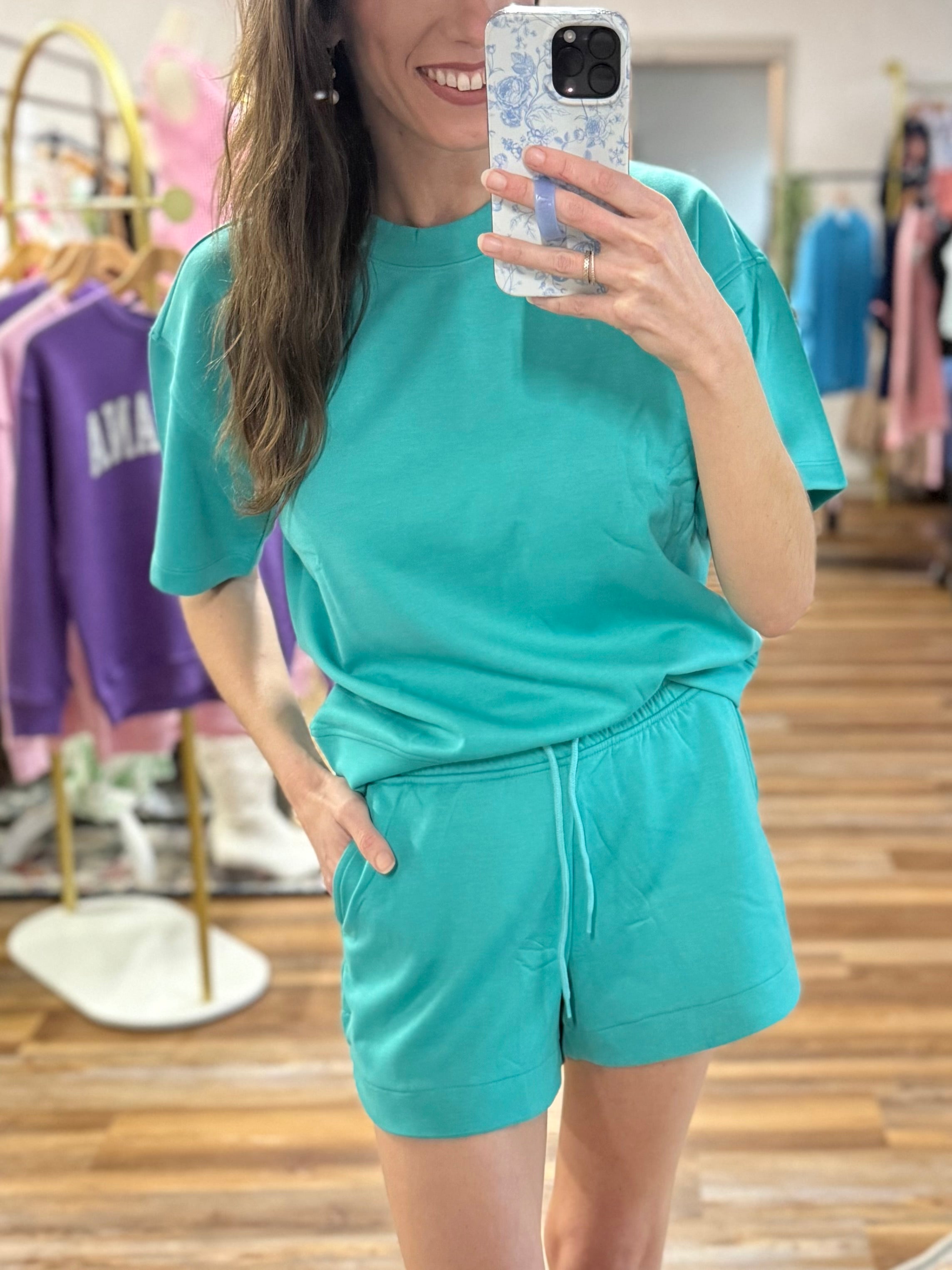 SCUBA ROUND NECK TOP & DOLPHIN SHORTS SET ** TOP TOTAL BODY LENGTH: 23.75", BUST: 44" approx. - MEASURED FROM SMALL ** SHORTS TOTAL WAIST: 25.5", INSEAM: 3.5" approx. - MEASURED FROM SMALL