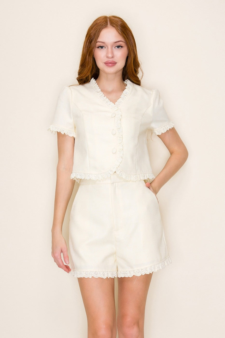 Crop jacket with serious style credentials. Contrast eyelets add edge, while delicate ruffles bring the charm. It's the perfect layer for anyone who refuses to pick a side between edgy and sweet. Throw it on and watch heads turn.
