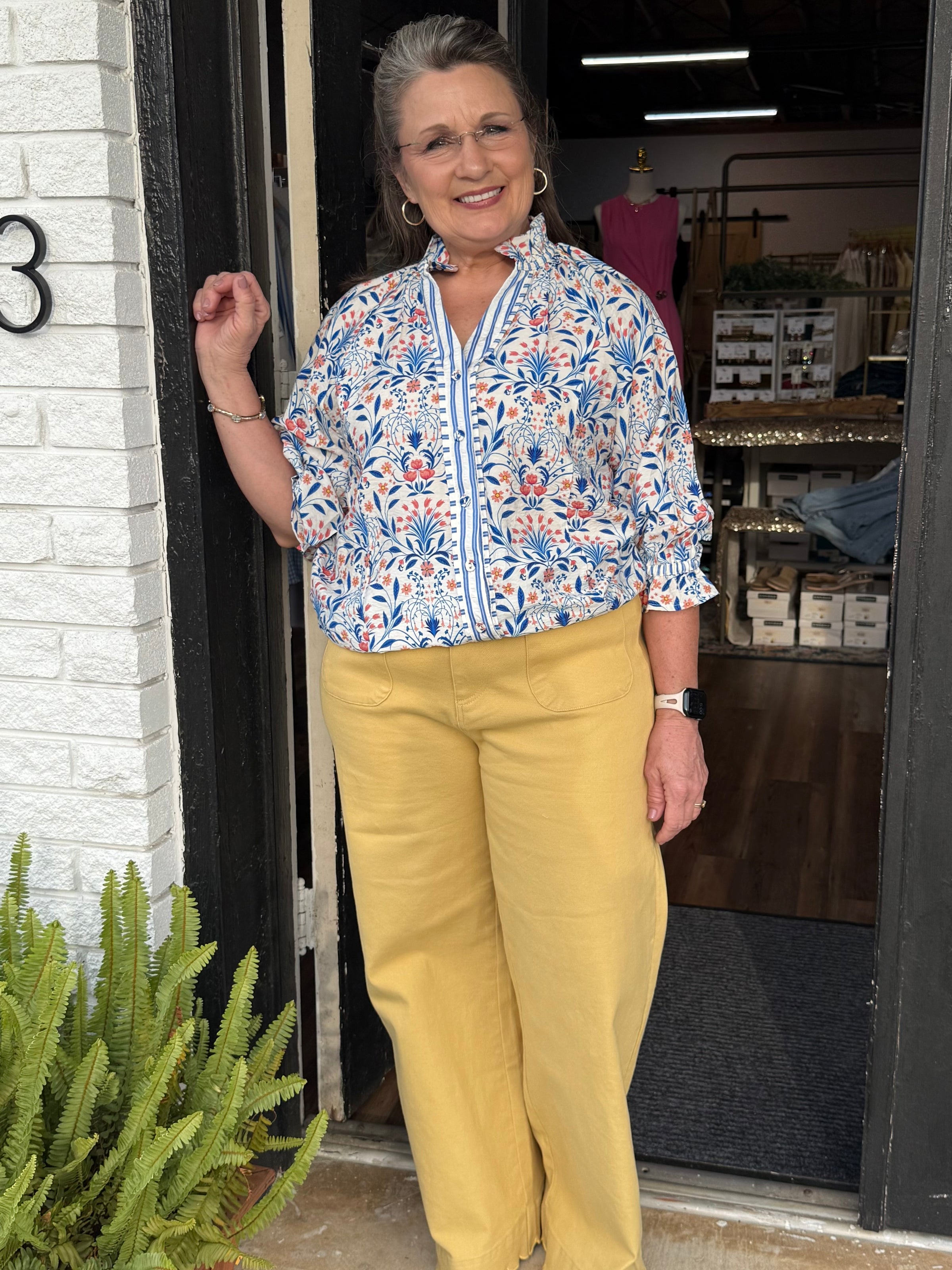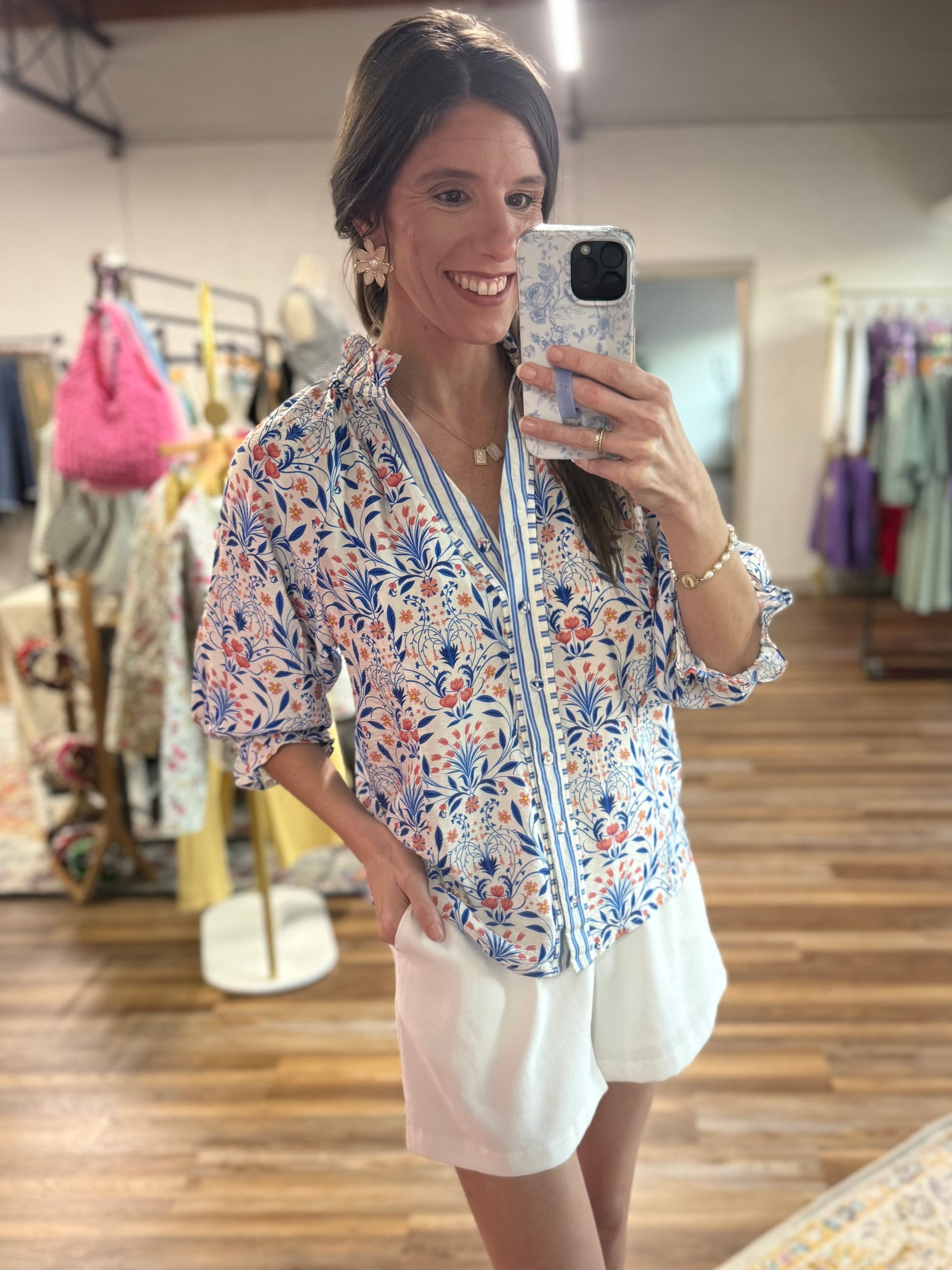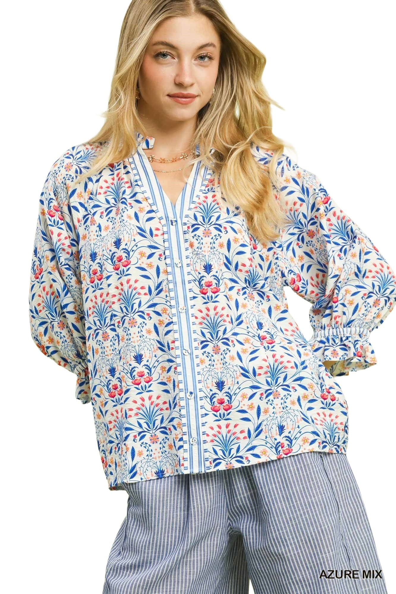 Bloom in style with this charming botanical blouse! Featuring an allover floral print, button-front closure, and a chic split neckline, it's perfect for effortless elegance. Long sleeves finish with delicate elastic ruffle cuffs for a touch of whimsy. Unlined for breathable comfort all day long.