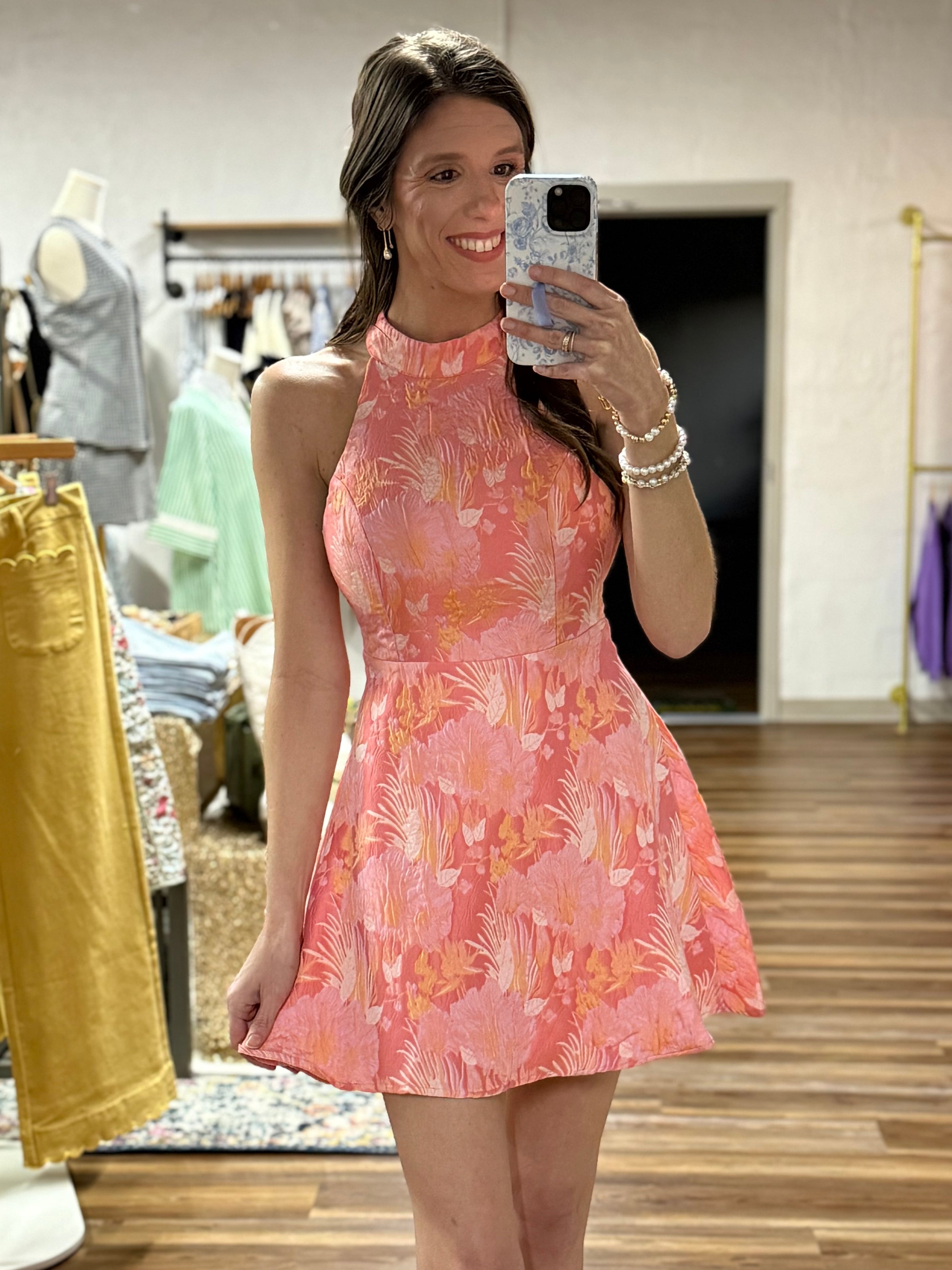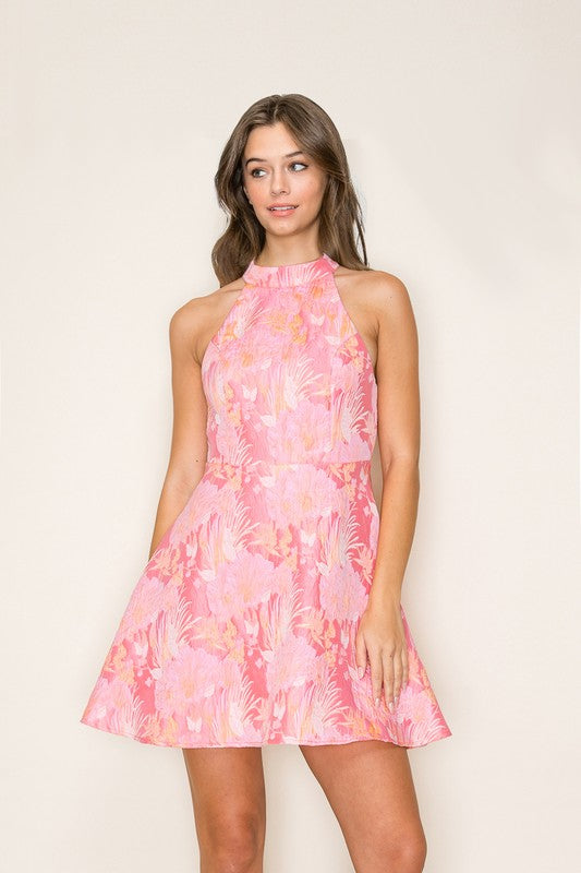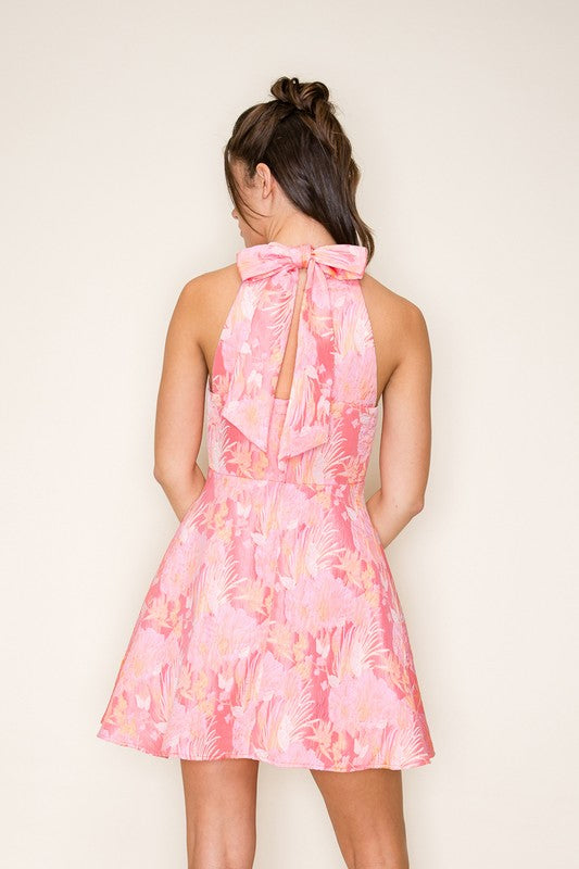 Twirl into spring in this stunning halter neck dress! Featuring a vibrant floral jacquard pattern that pops with color, it's paired with a charming ribbon back detail that adds just the right touch of elegance. Perfect for garden parties, brunch dates, or whenever you want to feel fabulous. This dress is your new go-to for turning heads and feeling confident.