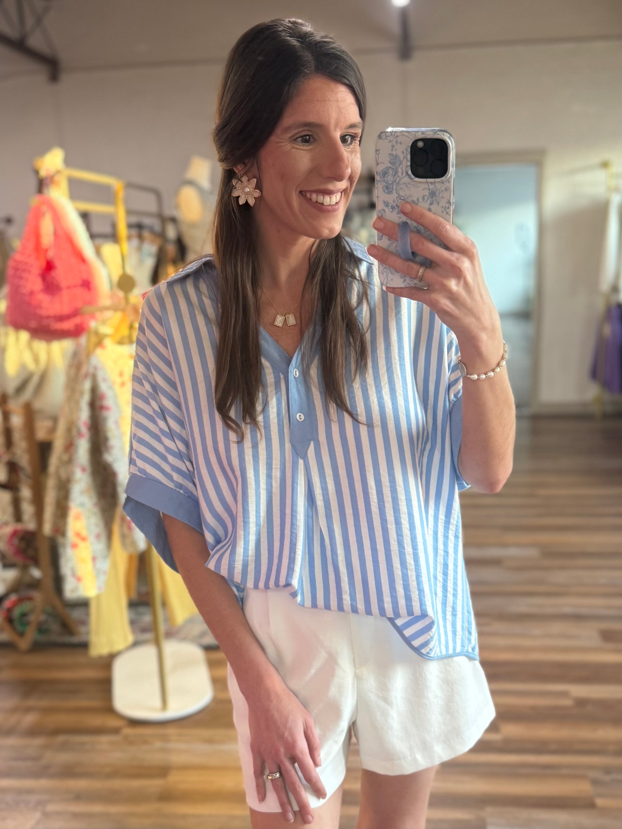 Effortlessly cool and undeniably comfy, this oversized button-front top is your new go-to. The split V-neck and contrast trim add just the right amount of personality, while short cuffed sleeves keep things breezy. Straight hem, unlined—basically, it's the laid-back piece that works harder than it looks.