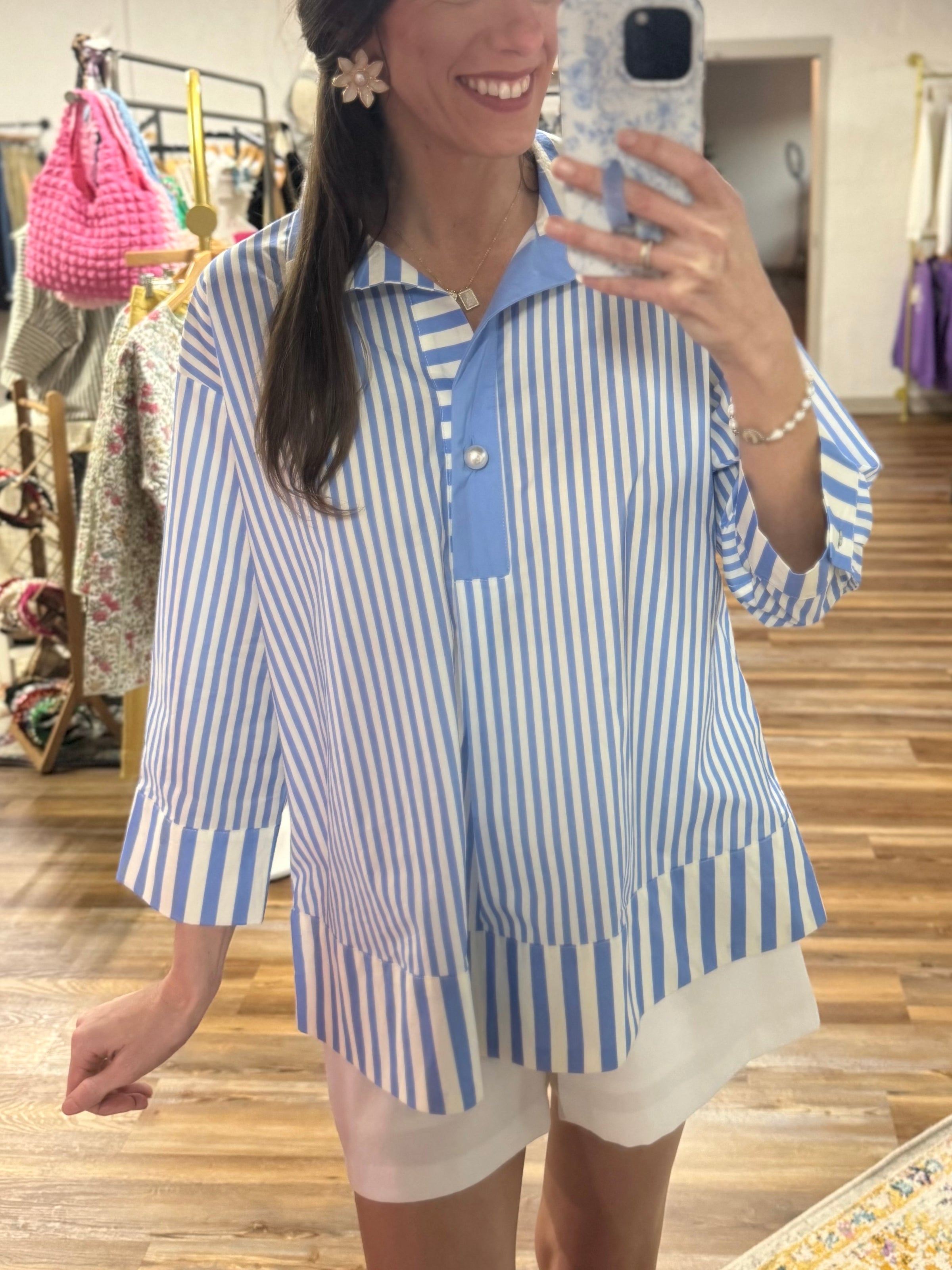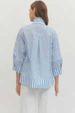 Stripes meet sophistication in this breezy 3/4 sleeve top. Wide collar, pearl button details, and cuff closures keep things polished, while the lightweight woven fabric keeps you comfy all day long. Non-sheer and unlined for effortless style.
