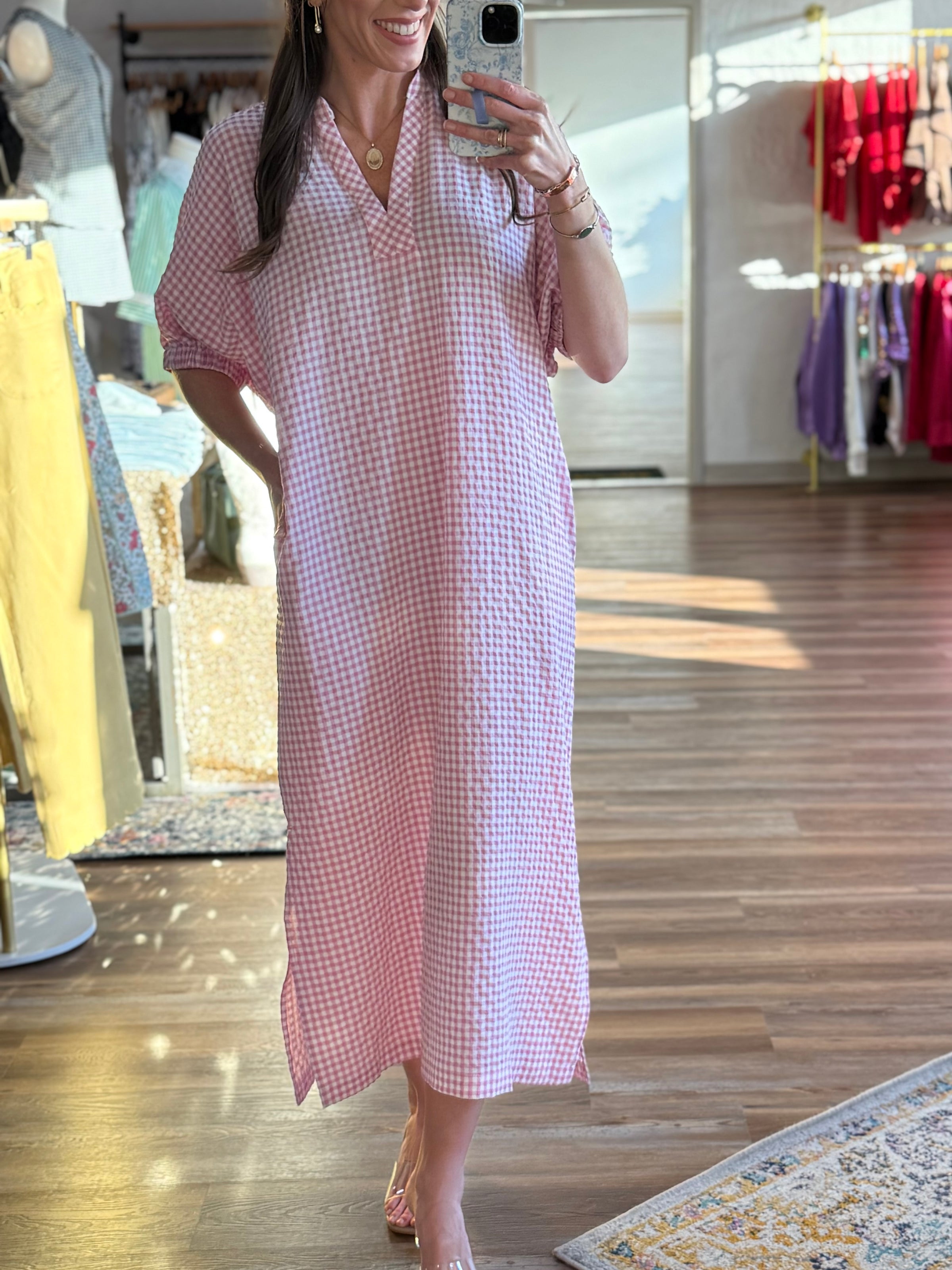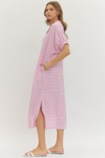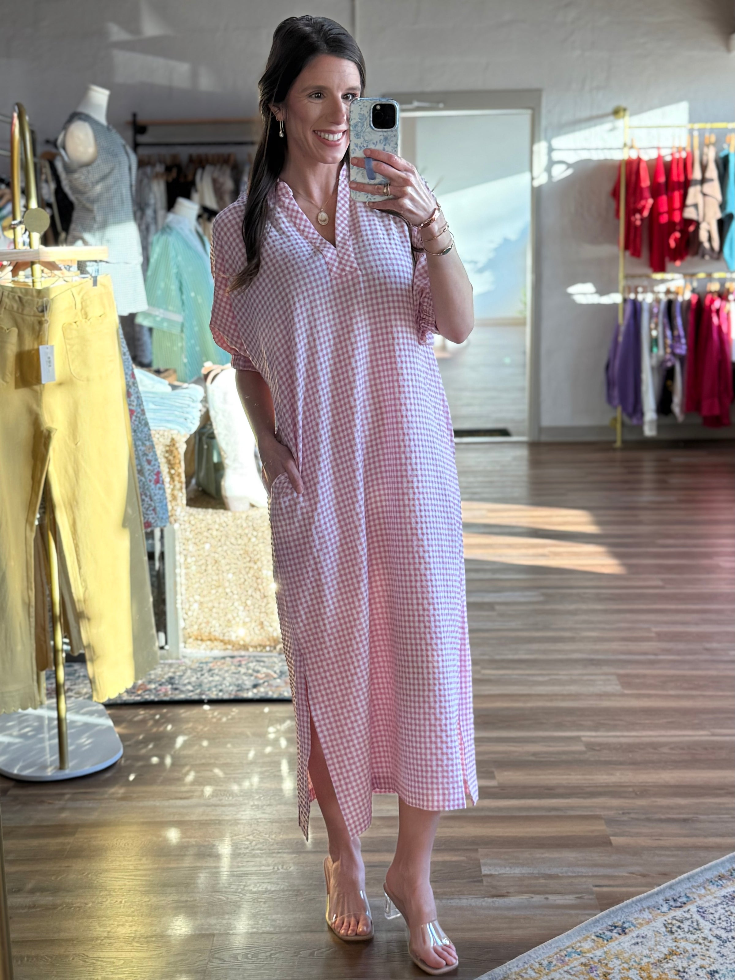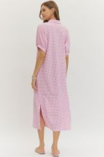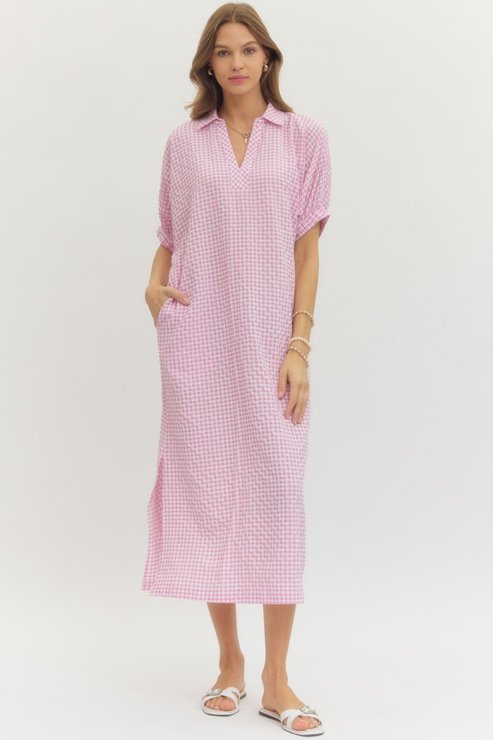 Adorable gingham check midi dress that's equal parts cute and comfy! Rock the classic collar with V-neckline, cuffed sleeves, and those oh-so-handy side pockets. Lightweight woven fabric keeps things breezy, while the unlined design means zero fuss. Perfect for casual days when you want to look put-together without trying too hard.